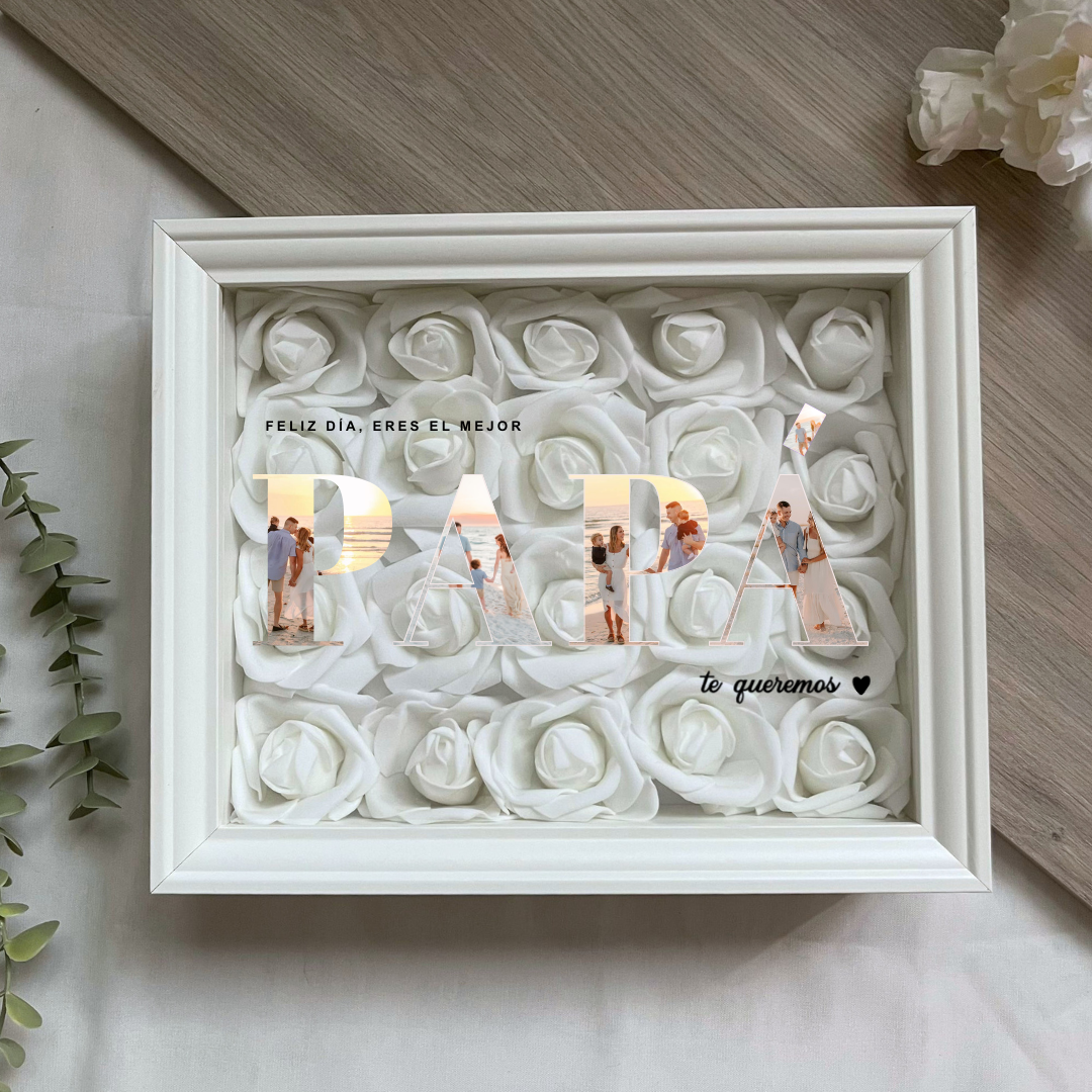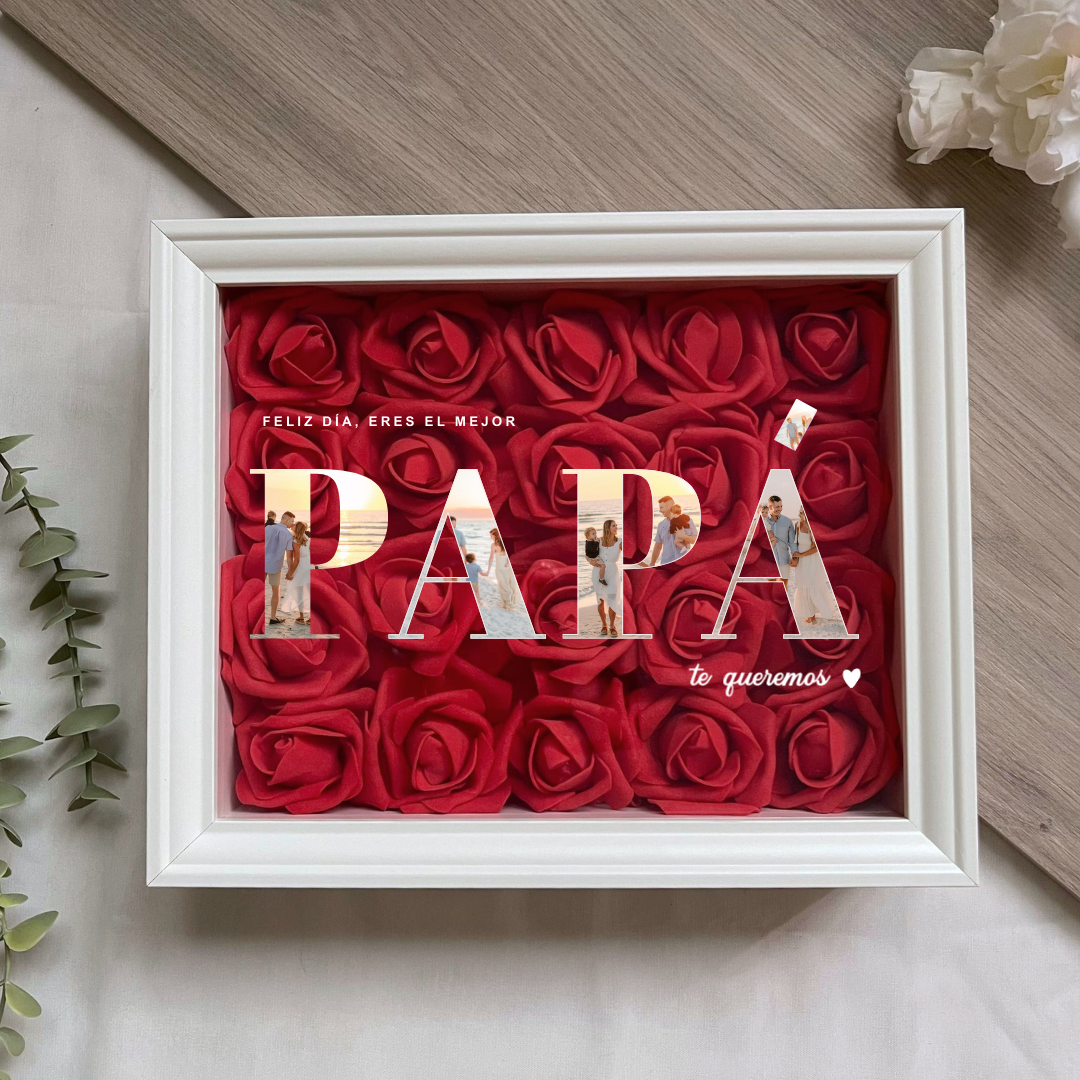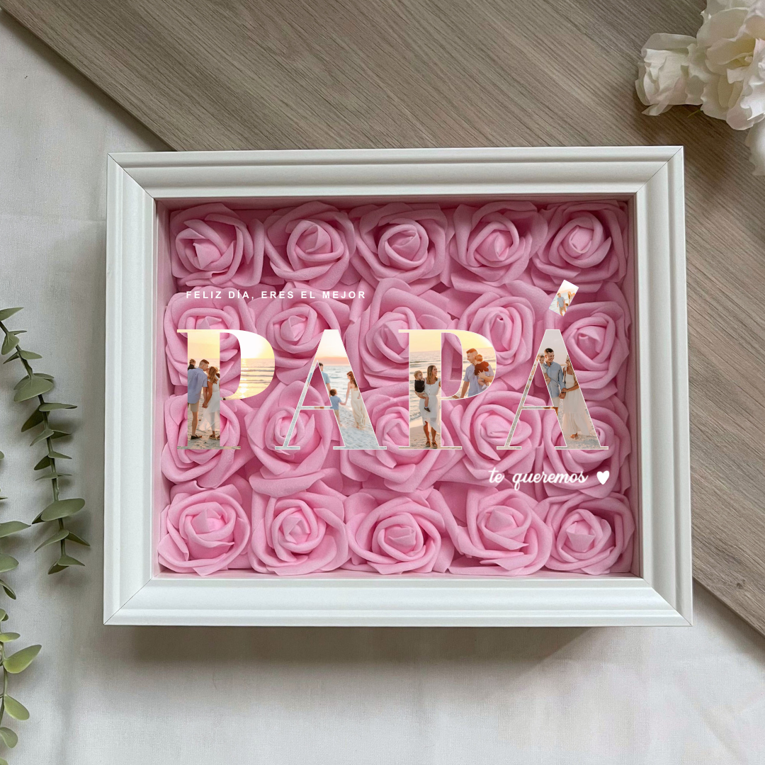 Este cuadro Personalizado hecho con rosas , es un detalle ideal para regalar en cualquier ocasión. Mide 20x25 cm y se puede colgar en la pared o apoyar sobre una superficie, como una estantería, una cómoda o una mesita de noche.