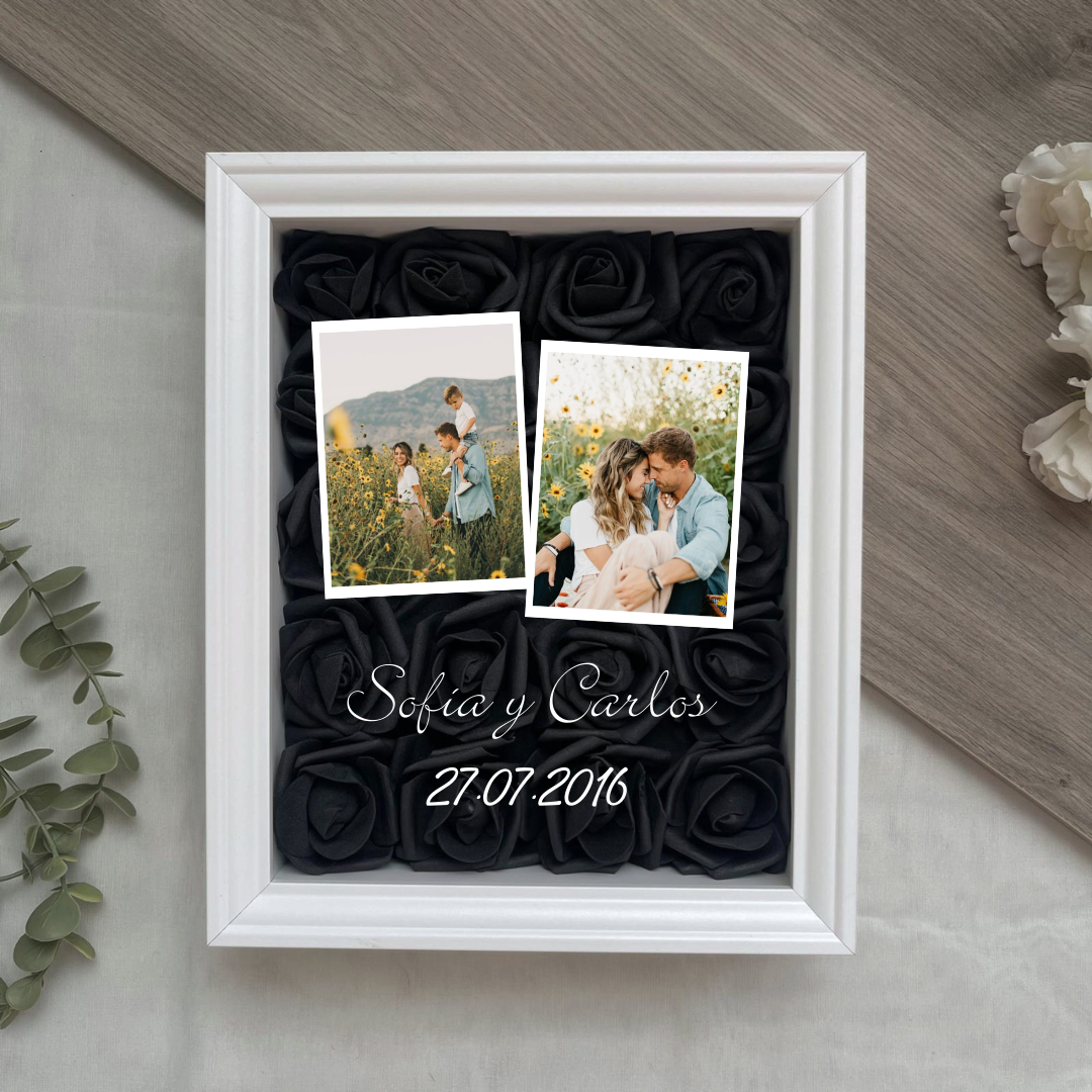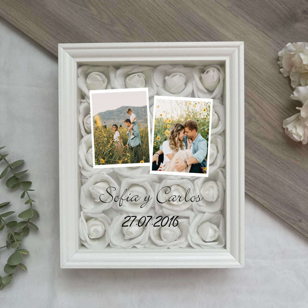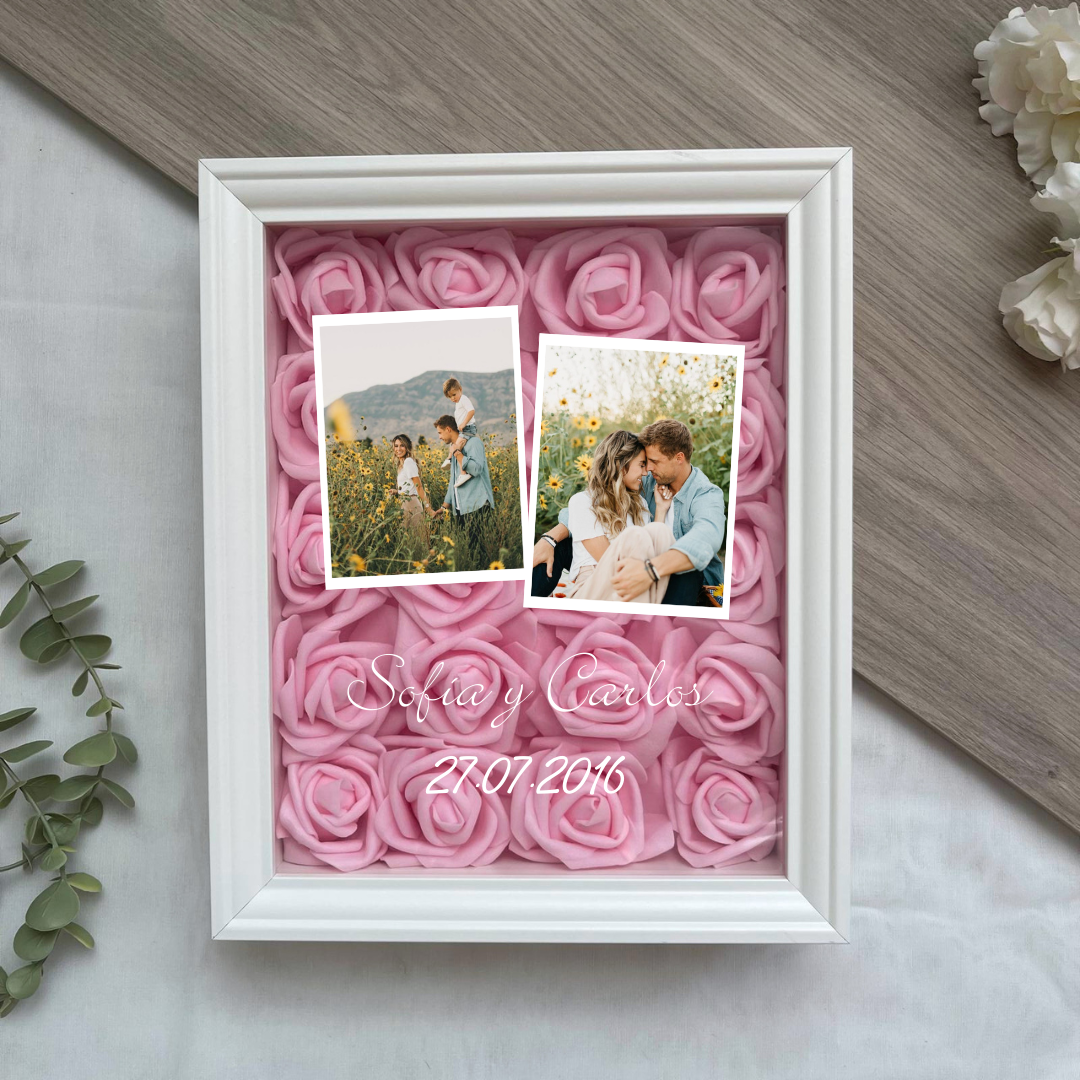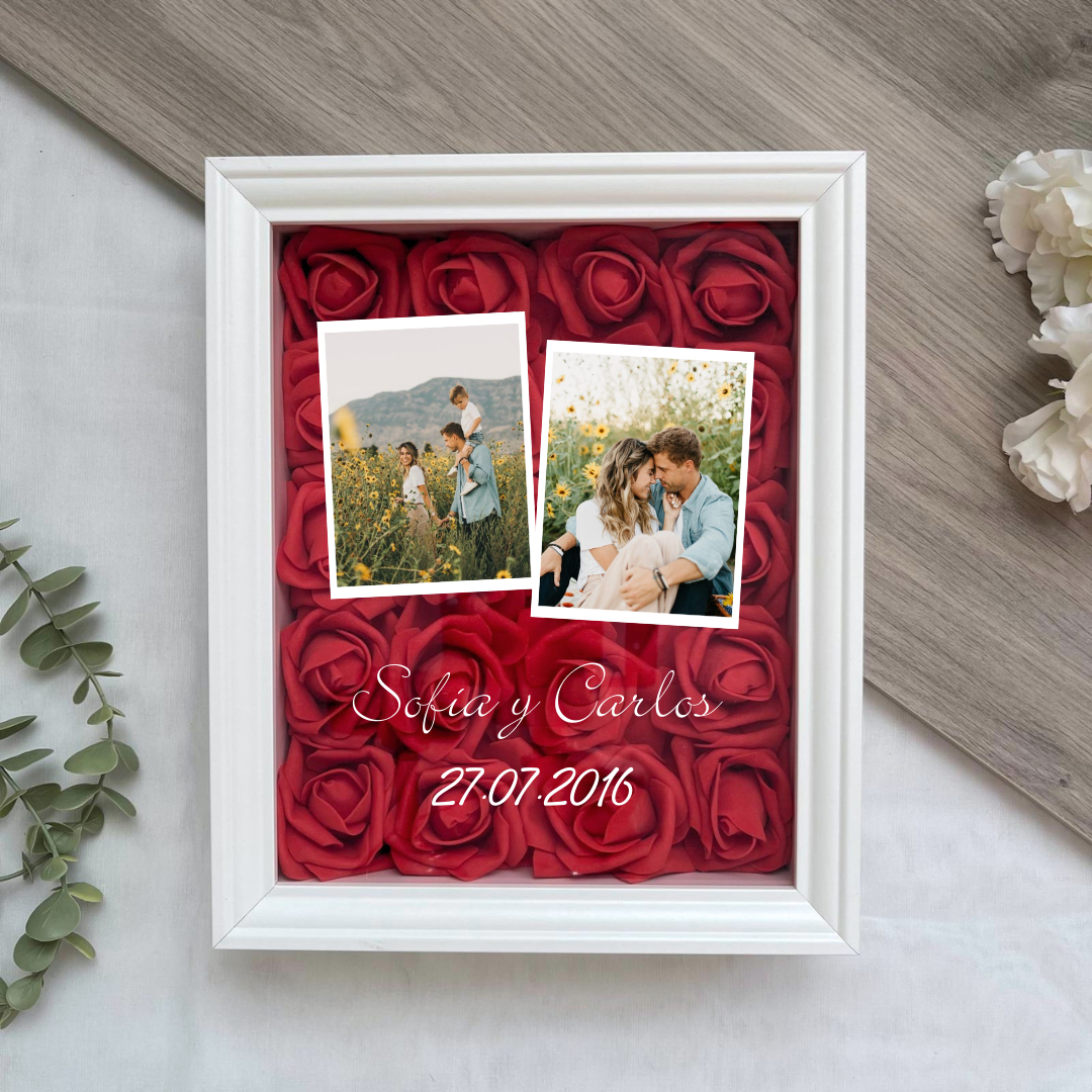 Este cuadro Personalizado hecho con rosas , es un detalle ideal para regalar en cualquier ocasión. Mide 20x25 cm y se puede colgar en la pared o apoyar sobre una superficie, como una estantería, una cómoda o una mesita de noche.