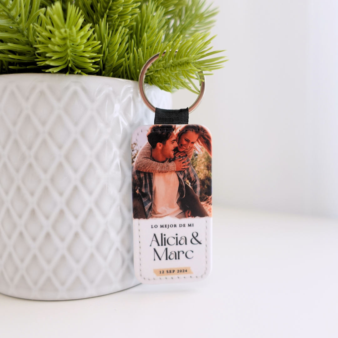 Este llavero es el detalle perfecto para llevar a todos lados contigo. Personalízalo con fotos, nombres o frases que lo hagan único. Con su diseño elegante y práctico, será un recuerdo diario lleno de significado.
