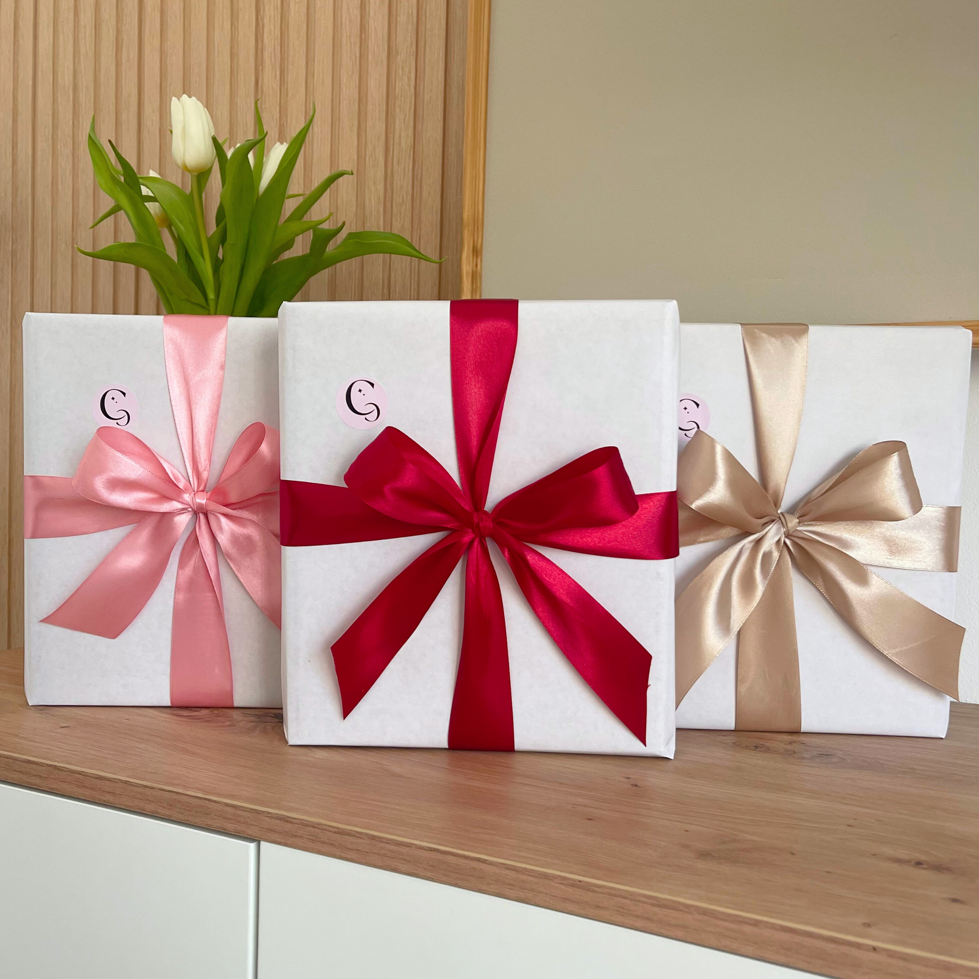 No es un envoltorio cualquiera, lo preparamos con detalle para que tu regalo impacte desde el primer segundo. Puedes elegir entre dorado, rojo o rosa según el estilo del momento.