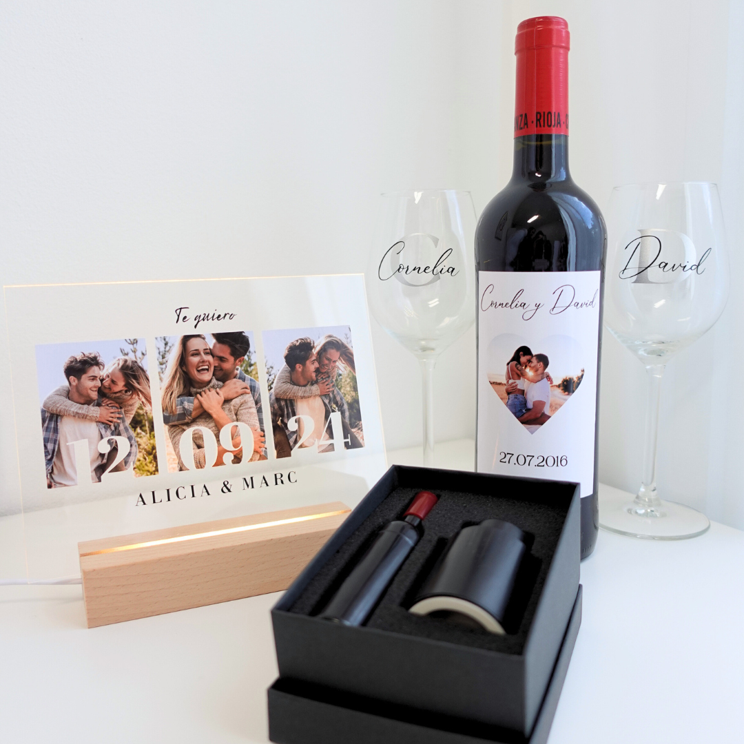 Nuestro Pack 'Elegance' ofrece una experiencia única, combinando vino, copas elegantes, una lámpara personalizada y un abridor funcional. Ideal para aniversarios, cumpleaños o celebraciones.