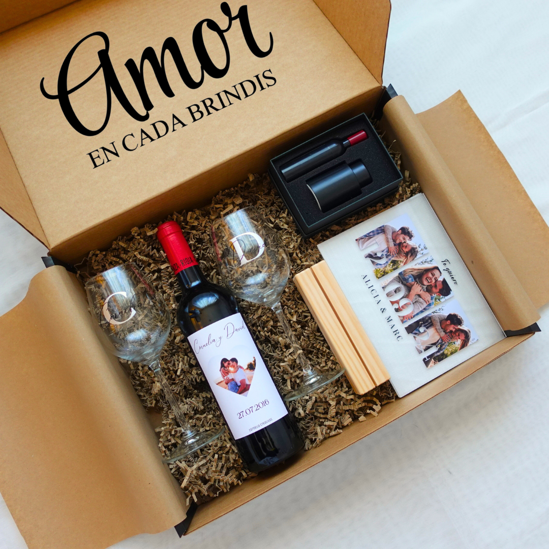 Desde la botella personalizada con su historia, hasta las copas con sus nombres y la placa con sus fotos y fecha especial: todo está pensado para vivirlo juntos